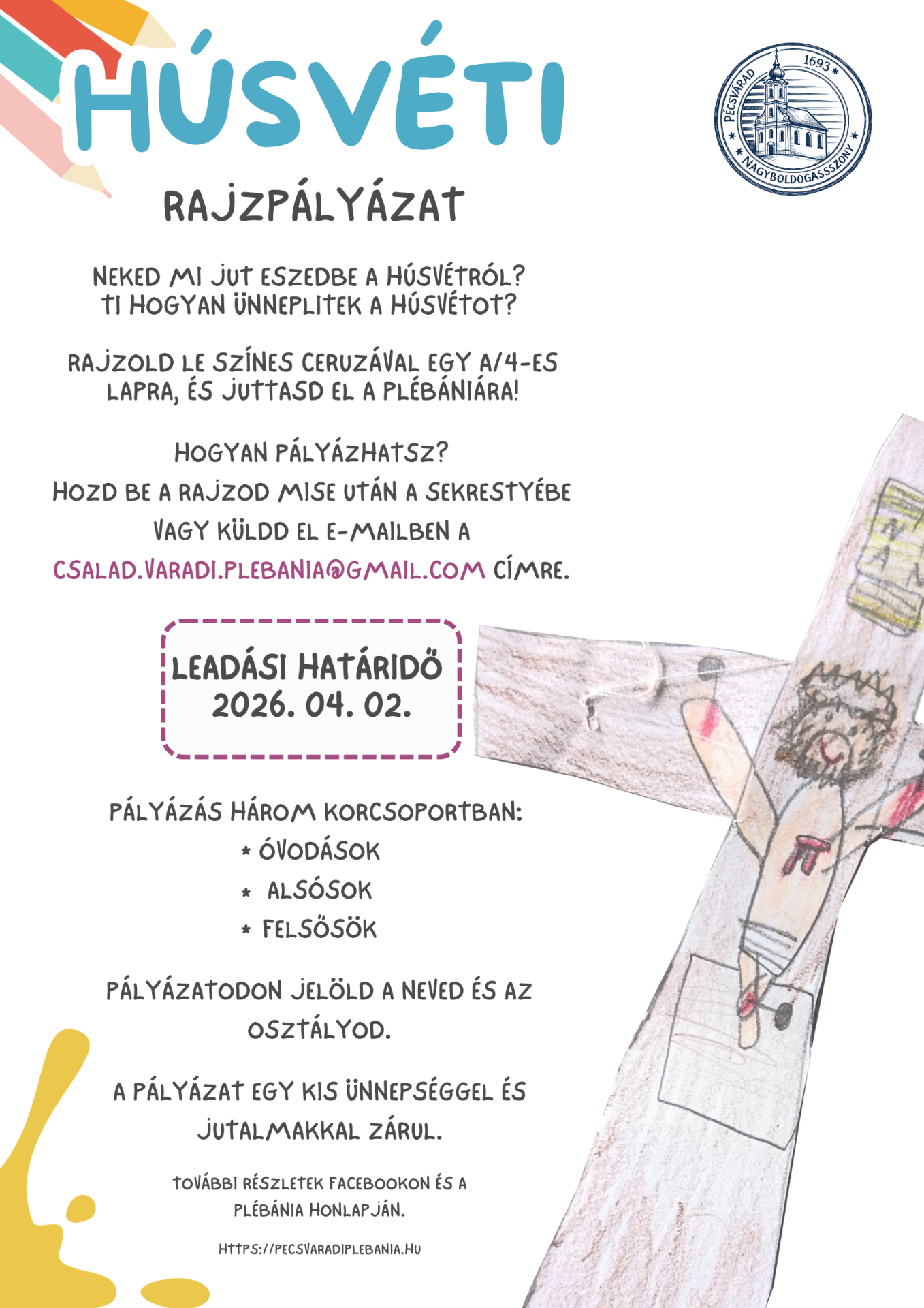 A gyermekek rajzai leadhatók személyesen vagy elküldhetők elektronikus formában is. Személyesen mise után a sekrestyében lehet leadni.